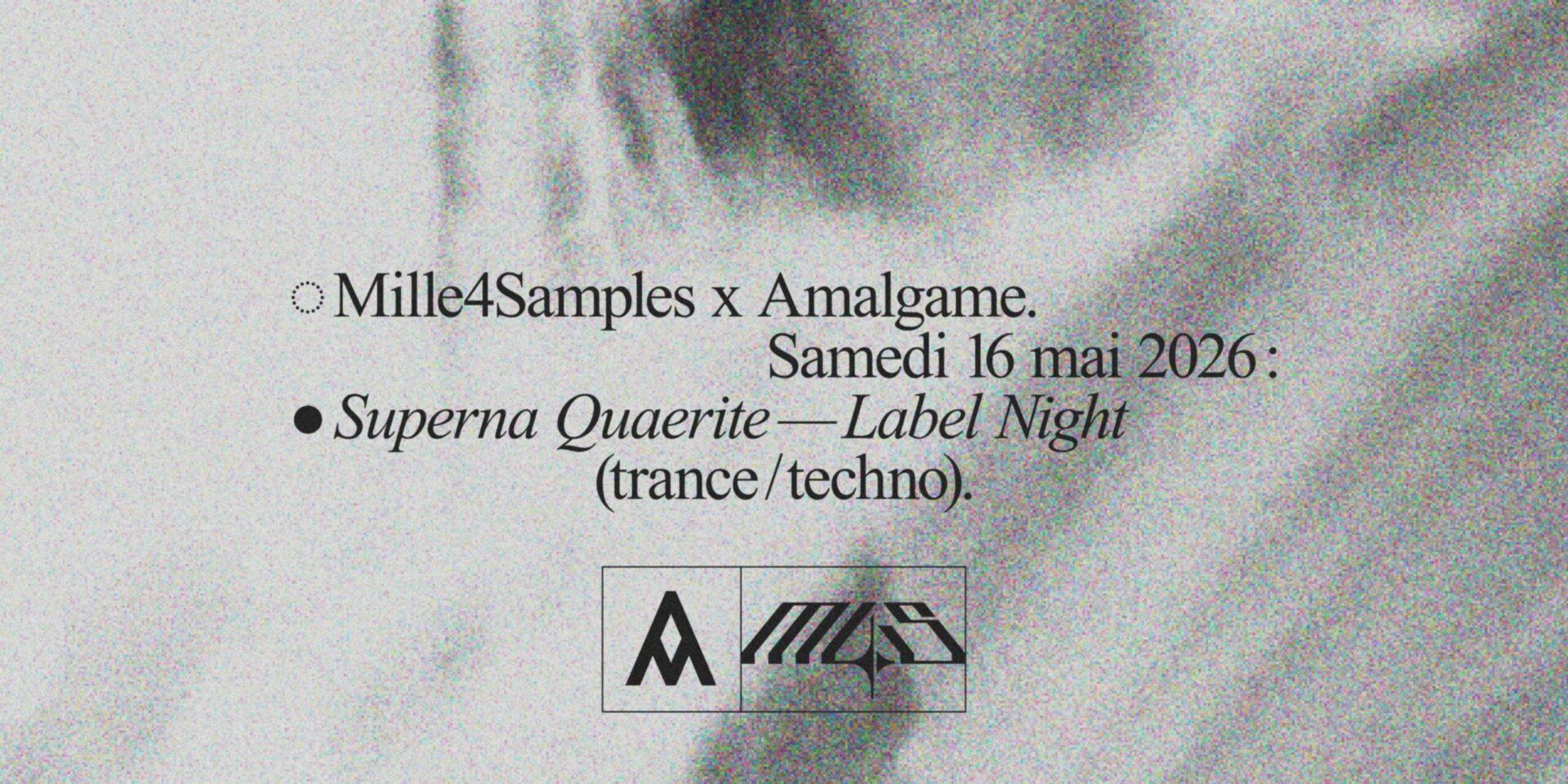 Le 16 mai 2026, Mille4Samples et l’Amalgame ouvrent une parenthèse en conviant le label Superna Quaerite. Le collectif de DJ et producteurs yverdonnois y déploiera son son chtonien aux frontières de la techno hypnotique et de la trance. Pour cette soirée, Baptiste Schaller et Colas Weber seront rejoints par Anesthesia, co-fondatrice du collectif genevois Cringe Core, et NSXSC du label de techno lausannois 33Records.